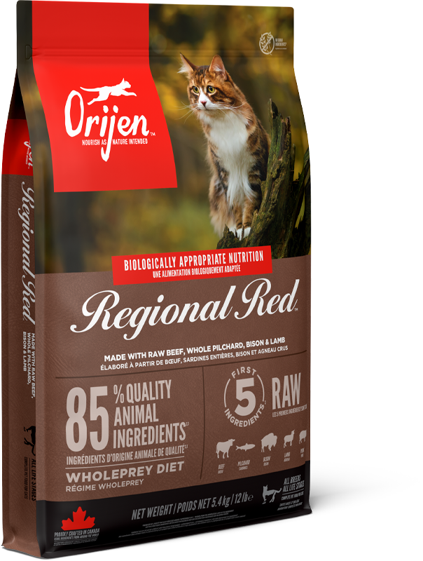A macskád egy valódi ragadozó, állati alapanyagokból származó fehérjékre és zsírokra van szüksége. A 85 %1 hústartalmú ORIJEN® Regional Red lemásolja a macska természetes étrendjét, hiszen a húsokon kívül belsőségeket, porcokat és emészthető csontot is tartalmaz. Marha, bölény, bárány, sertés és a Csendes-óceánból fogott szardínia biztosítja a fehérjék és zsírok változatosságát, továbbá az illat-és ízorgiát. Az állati alapanyagok nagy része nyersen2 érkezik, a tápszemcséket fagyasztva szárított májjal vontuk be, a cicád imádni fogja!